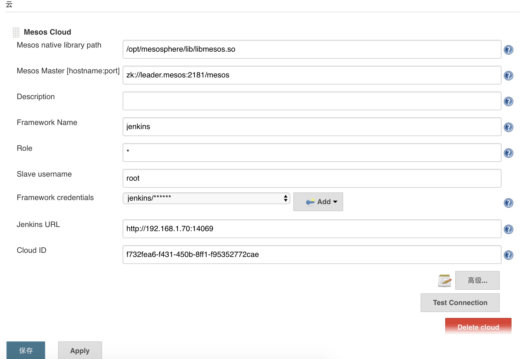 通过菜单“系统管理”——“系统设置”打开系统全局配置,下拉到底部“云”——“Mesos Cloud”配置块部分: