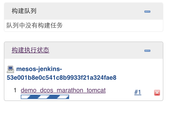 点击右侧执行图标,立即执行。Jenkins调用接口向DCOS集群部署启动一个mesos-jenkins slave节点,执行此任务: