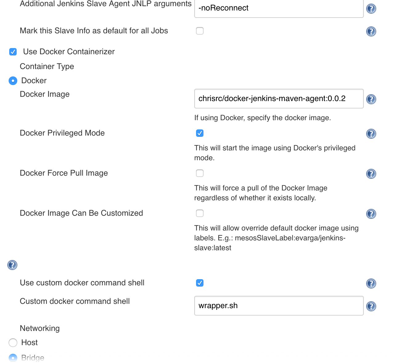 继续点击底部的“高级”按钮,可以自定义启动的Jenkins Slave主机所使用的Docker镜像。默认,Jenkins会使用“mesosphere\/jenkins-dind”镜像文件。注意,可以根据自己的需要,在“mesosphere\/jenkins-dind”镜像的基础上构建自定义的编译环境。